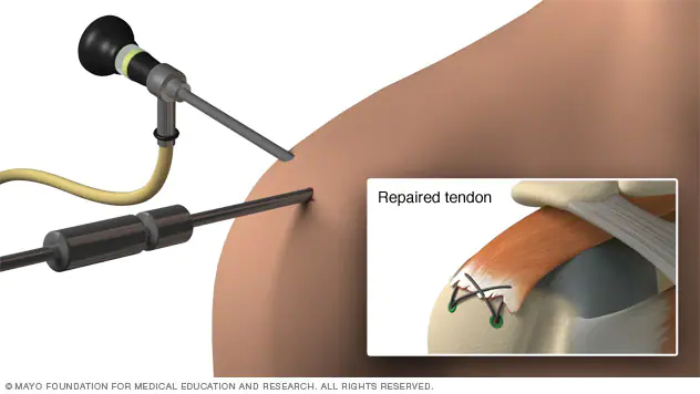 Utilizando un equipo especial de alta tecnología, se visualiza la articulación a traves de una cámara y fibra optica, se colocan pequeños tubos especiales para introducir instrumental y suturas a la articulación y así poder reparar el tendón lesionado. Como ventaja, es mucho menor el daño a los músculos del hombro y la recuperación inicial es más rápida. Cirugía compleja que requiere un cirujano entrenado especialmente en esta técnica.